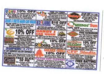 Buffalo Wings, Subway, Carls Jr, Dominos, Fosters Freeze/El Pollo Loco, IHop, Mateo's, Shine & Brite car Wash, EZ Lube, Quizno's Sizzler, Robeks, Coco's, Shakey's, Rally's, etc... This card can pay for itself on its first use.