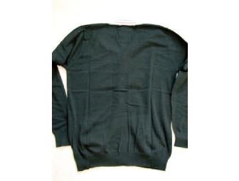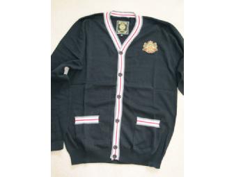 Fashion forward Large men's cardigan sweater in charcoal with grey, white, red trim. A new spring necessity. Check out the selection on the web site at http://LiveMechanics.com Live Mechanics is the Odiase Family business.