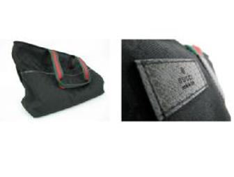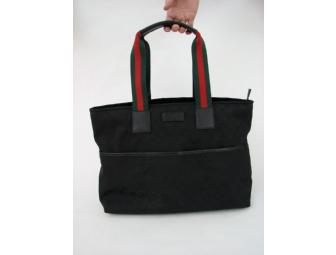 Gucci tote bag with double straps, zip-top closure; open front pockets; inner double and zip pockets.