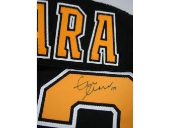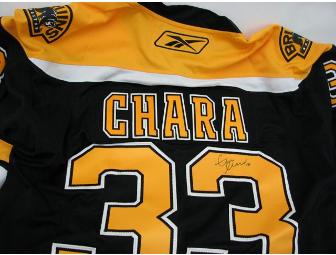 The Jersey is signed y Captain of the Boston Bruins, Zdeno Chara, "The Big Zee". The tallest player to ever play in the NHL, Chara is the 2009 Norris Trophy winner. He has played in 4 NHL All-Star games, winning the All-Star Hardest Shot competition 3 years running and setting a new record of 105.4 mph in 2009. He has also played in the 2006 and 2010 Winter Olympics for Slovakia and has represented Slovakia in the World Championship twice.