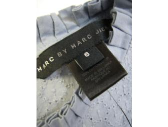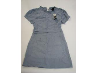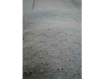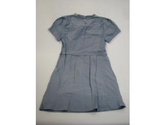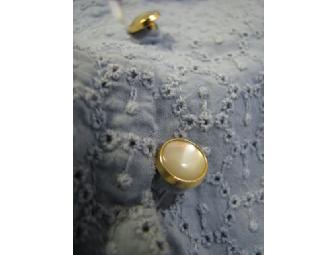Combination of smooth and textured cotton fabric. Empire waist, ruffled collar, puffed short sleeves. Closure of 3 pearled buttons on the back (see picture).