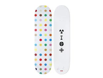 Hirst is known for his iconic graphic Spot paintings that depict rows of randomly-colored circles. Supreme will release a series of five individually designed decks and a Box Logo tee designed by Damien Hirst featuring his Spot paintings.