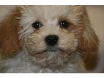 Here is a puppy to care for and love! From Barkworks in Thousand Oaks comes this adorable white and apricot Cavalier King Charles Spaniel and Maltese Hybrid puppy. It is a male and he was born on February 12. He comes with a vet exam, training class, crate, and puppy starter-kit.