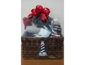 This Point Vicente Spirit Basket includes the following: fleece blanket in navy; red tote bag; child lighthouse grey crewneck sweatshirt size Medium; child lighthouse light blue t-shirt size Medium; adult lighthouse grey t-shirt size Large; adult lighthouse full zipper red sweatshirt size Large; adult lighthouse crewneck white sweatshirt size Small; lighthouse navy hat; Point Vicente thermometer; lighthouse decorative canister.