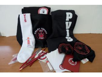 This PVIS Spirit bag includes the following: PVIS keychain, tote bag, tube socks, 2 book covers, sweatpants (YXL), t-shirt (Adult Medium), spiral notebook, eraser, 4 pencils, 2 PVIS post-its, 3 stickers, lip balm, pen, and magnet.