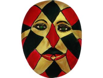 Artist Marlene Sanderson of Greenwood Village., Colo., titled her mask, "Green Eyed Harlequin." She has painted for many years in watercolors, acrylics and oils.