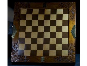 Beautiful Hand-Carved Chinese Chess set with playing pieces. Pieces are stored in two drawers. Intricate dragon carvings along corners of the playing board.