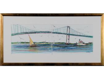 This mixed media work, Rose Island Light -- Pell Bridge, Newport, RI is donated by Newport artist Joseph Matose and it illustrates his love of Rhode Island's City by the Sea. It's a $550 value. Joe created his first painting when he was two -- and kept at it. By high school his work was gaining attention, and he later attended both the University of Rhode Island and the Rhode Island School of Design. His award-winning work has been seen in several galleries and it also illustrates books of poetry penned by the artist himself. This pen-and-ink with watercolor is framed and matted, measuring 15"H x 29 ½"W.