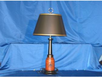 Item #211 will light up your day! It's a table lamp donated by Rhode Island College in Providence and is valued at $170. This item is a beautiful table lamp that is 11 inches wide, 11 inches deep, and 26 and a half inches high. It's finished in black and cherry stain with the Rhode Island College seal on the base. It will make a lovely addition to a den or office. What a great graduation gift this classic Rhode Island College table lamp would make!