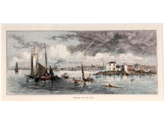 This is "Newport from the Bay" -- a hand-colored, woodcut engraving. It's from "Picturesque America" -- a pair of picture books popular in the mid 19th Century, regarded by at least one historian as helping Americans to celebrate one, continental nation following the trauma of the Civil War. "Picturesque America" featured the work of many notable illustrators, including the creator of this piece, engraver J.G. Smithwick Donated by Stephan and Julia Brigidi of the Bristol Workshops in Photography, Bristol, RI, the mint-condition print itself measures 5" x 10". Matted in museum board, overall dimensions are 14" x 16" in its gold wood frame.