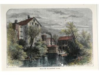 "Picturesque America" was a popular, two-volume set of picture books published in the 1870s that helped Americans build an image of a unified, continental nation. Featuring the work of noted illustrators of the time, it presented views from New York to California, Maine to Florida. This hand-colored wood engraving, taken from "Picturesque America", is "Mills on the Blackstone River". It's the work of author, naturalist and illustrator William Hamilton Gibson. Donated by Stephan and Julia Brigidi of the Bristol Workshops in Photography, Bristol, RI, it's in mint condition, measuring 7" x 10". Matted in museum board, overall dimensions are 12" X 14" in its gold wood frame.