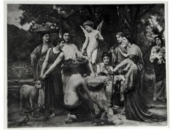 19th-Century French Academic painter William-Adolphe Bouguereau painted mythological subjects with great realism, as shows in this 1983 rotogravure image of his "An Offering to Cupid". The image is in mint condition and measures 6" x 11". It's mated in museum board and, in its silver wood frame with design, measures 16" x 20" overall. It was donated to Rhode Island PBS by Stephan and Julia Brigidi of the Bristol Workshops in Photography, Bristol, RI.