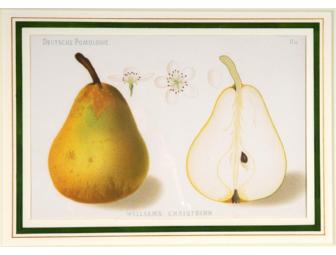 Deutsch Pomologie was a German publication, composed of studies of fruit, published in the late 19th Century. This page shows the "Williams Christbirn", taking its name from an early British gardener. Here in North America, we know it as the Bartlett pear. This print's dimensions are 5 ½" x 8 ¼'. In mint condition and matted in museum board, the overall size is 14" x 16" in a gold wood frame with design. It was donated by Stephan and Julia Brigidi of the Bristol Workshops in Photography, Bristol, RI.