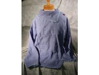 Item #571 is a women's jacket by Studio, donated by Elementz Unique Apparel in Wickford. Elementz! is a cozy little boutique right in the heart of downtown Wickford. Our customers are "fashionistas" who want to look and feel great at any age and regardless of their size. This jacket, designed by Studio, is a blue hand-stitched loose jacket with fringed edging. It fastens with a wooden button at the shoulder and is sized extra large. This item is exchangeable for the price of your high bid.