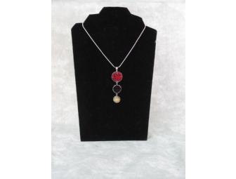 This handcrafted sterling silver pendant was created using handmade, ceramic discs, bezel set in sterling silver. This colorful pendant measures 3” and is hung from an 18inch silver snake chain.