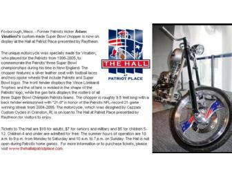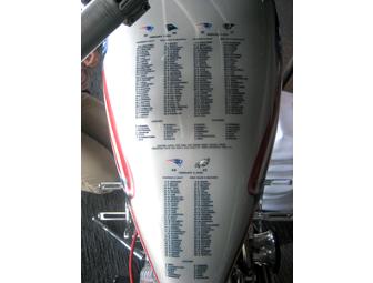 The unique motorcycle was specially made for Vinatieri, who played for the Patriots from 1996-2005, to commemorate the Patriots’ three Super Bowl championships during his time in New England. The chopper features a silver leather seat with football laces and two-spoke wheels that include Patriots and Super Bowl logos. The front fender displays the Vince Lombardi Trophies and the oil tank is molded in the shape of the Patriots’ logo, while the gas tank displays the rosters of all three Super Bowl Champion Patriots teams. The chopper is roughly 9.5 feet long with a back fender emblazoned with “21-0” in honor of the Patriots NFL-record 21-game winning streak from 2004-2005. The motorcycle, which was designed by Cazzani Custom Cycles in Cranston, RI, is on loan to The Hall at Patriot Place for visitors to enjoy.