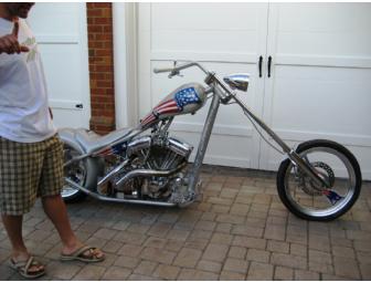Some people have said you can't have two-spoke wheels on a motorcycle, but Jimmy Cazzani proved them wrong with his New England Patriots logo design. To ensure the wheels would hold up under the abuse of the road, the design was sent over to Greg at Ego Tripp Wheels, where they machined the wheels to not only look cool but to be safe and reliable as well. The front sports a 21-incher wrapped in Avon rubber, while out back an 18x8.5-inch rim stuffed inside a 250mm Avon helps the rigid ride a little more smoothly. While Ego Tripp was machining the wheels, Bobby also had them cut a set of rotors to match. Then, to help bring the bike to a quick stop, he bolted on billet six-piston racing calipers at the front and rear.