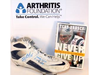 This autographed Right Cleat was worn by Tedy Bruschi during the January 14, 2006 Game where the Patriots played the Broncos. Also included is the book Never Give Up authored and autographed by Tedy Bruschi.