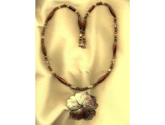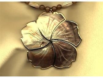 This beautiful necklace's focal point is the stunning 2 1/2" Mother-of-Pearl inlaid flower pendant with gold-plated outline and edging, accompanied by long oval wood beads, accented with natural shell rice beads, golden brown Cat's Eye and natural mother of pearl beads to enhance the overall design. This necklace is sure to bring many compliments to the wearer. Definitely one of a kind! Necklace is 26" long.