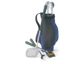 Bid today on this unique gift for the griller in the family. Enjoy these stainless steel barbeque utensils in the shape of golf clubs. Package includes a spatula, fork, tongs and brush all held in a golf bag complete with cover and side zipper compartment. Makes a great gift!