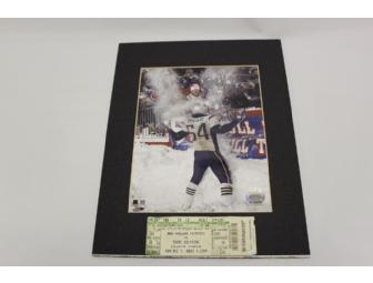 This incredible photo of Tedy Bruschi was taken on December 3, 2003 after the New England Patriots defeated the Miami Dolphins 12-0, included with the picture is a game ticket from this game.
