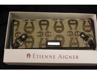 Organize your assets with this signature Etienne Aigner checkbook wallet! Colored camel, this wallet has 7 slots for credit cards, a removable checkbook, and zippered change pocket. Stylish and versatile, this checkbook wallet is perfect for everyone!