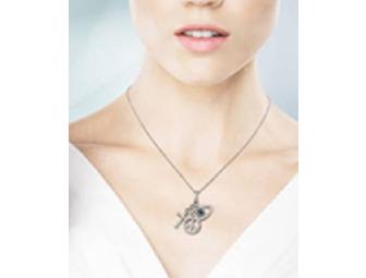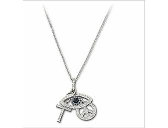 Add an element of modern classic to your persona with this rhodium-plated chain with three charm pendants. The peace symbol, cross and the evil eye sparkle in clear crystal pavé.