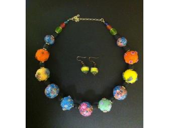 Don't miss the chance to take home this beautiful handmade matching necklace and earring set! Artfully crafted from round beaded beads and polymer clay beads in shades of blue, pale yellow and tangerine, this necklace in shades of summer is sure to turn some heads. The matching yellow and green beaded earrings are the perfect compliment to this unique piece. This set is one-of-a-kind and makes a great gift so bid today!