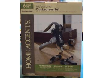 6-piece rabbit-style stainless steel corkscrew set includes: corkscrew, wine pourer, drip guard, foil cuttler and wooden case.