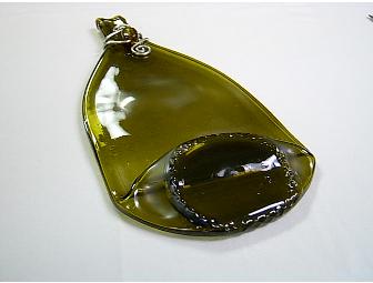 This auction is for a unique, glass Wine Bottle Cheese Tray that has been melted down and turned into a serving dish, donated by Pam Yeager of All Wired Up Designs.