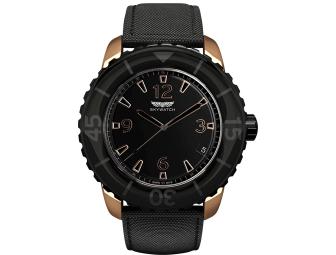 Skywatch is a unique, modern twist on the classic diver's watch. This Swiss-made timepiece, featuring quartz movement and a 44mm bezel, is black with a rose gold case, numbers and hands. The use of a light blue loop on the watch strap is a signature touch of this charismatic brand. Skywatch is a substantial watch, but doesn't take itself too seriously, striking a balance between accessibility and premium status.