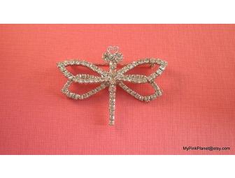 Beautiful, dragonfly brooch with overlaping wings. Made from hand laid rhinestones, a technique invented in the 1940's, with silver electroplate, and signed by the artist. This piece measures 2 1/2 inches in wing span.