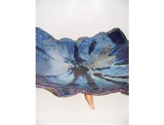 This Pulsar Platter, created by John Fazzino, is a beautiful example of fired claywork. The inside of the platter features surface glazed with various shades of blue, designed to place you inside of the night sky. The platter is raised on three clay legs. The base of the bowl features a natural clay finish, giving the piece an earthy tone.