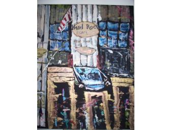 This depiction of the Hard Rock Cafe is created out of mixed media on pressed board by the artist, Lara Sebastian.