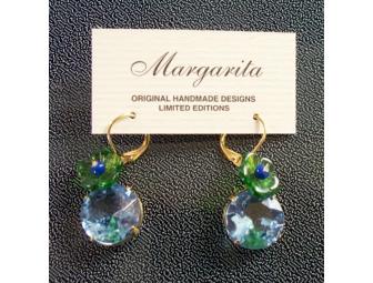 It's often difficult to make the old look modern and whimsical, but artist Margarita seems to have the touch. This auction is for a pair of blue vintage glass earrings featuting a green flower. All of the glass that went into making these earrings was derived from glass created in the 1950s so they are absolutely unique. Be the belle of the ball or the star of the sidewalk with these all-purpose everyday earrings.
