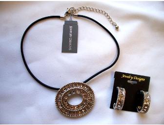 Feminine with a bit of edge with this oval silver pendant and square cut rhinestones on a leather cord. Matching silver and rhinestone hoops complete this look. Who says you can't be a rocker and girlie at the same time?