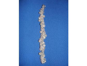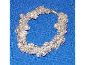 This bracelet measures 7" in length. It is knit with silver wire and has a magnetic barrel clasp.