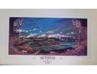 Calling all PawSox fans! Take in the bright lights of McCoy Stadium all year round with this reproduction of Thomas Lynch's 1994 painting of McCoy Stadium. Although a few things may have changed since, this almost fifteen-year old reproduction is worth taking a look at. You just might see yourself in a seat!