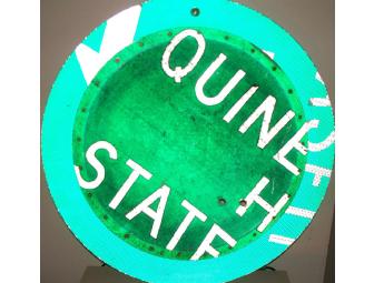 This one of a kind piece has been "humanufactured" out of recycled Rhode Island street signs. This particular platter has been created from Department of Public Works signs. Green and white in color, this platter can serve as a semi-functional wall hanging or featured in whatever way suits you.