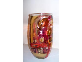 This one-of-a-kind vase features a beautiful color combination of purples and pinks, with accents of green. The different patterns throughout, from the swirls, swivels, and circles, make this vase visually interesting but not overwhleming. It's fun and whimsy!