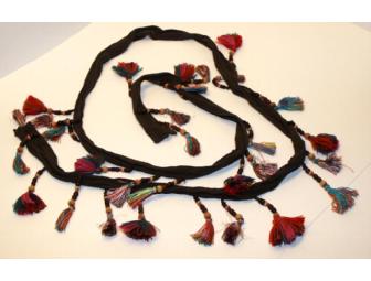 Fun crinkle brown fabric belt with multi-colored beads on tassels, 66" long.