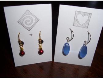 At a recent craft fair shoppers praised the earrings created by crafter, Donna Greenlaw. You are bidding on two pair of glass bead earrings. One pair is red and gold-plated lever back and the other is a created silver hoop with smoky-blue bead. A beautiful accessory!