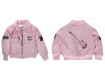 Bid today on this fantastic jacket, perfect for any Rock & Roll Girl. The eye-catching Rock & Roll Jacket will make little girls think they are rock stars! It features four music-related embroideries including "Girls Rock!", musical notes, a drum set, and a large guitar on the back. An oversized silver metal guitar is used as the zipper pull. Made of heavyweight washable nylon, this is water resistant. Bid now and ROCK ON!