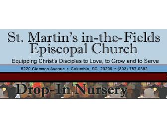 Fabulous drop-in nursery opportunity! Use this $50 gift certificate toward the purchase of child care at St. Martin's in the Fields at $6.50/hour. No reservations needed. Child must be registered. $50 registration fee applies. Hours of operation are Monday, Wednesday, and Friday from 9 a.m. through 1 p.m.