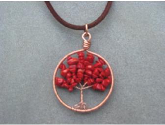 A beautifully handcrafted "Tree of Life" pendant made of tarnish free copper on velour tubing, with natural stones and beads.