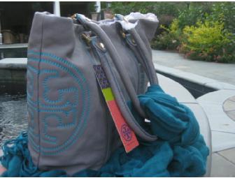 Be a trend setter with these chic designer items from VanJean, including a Tory Burch gray and turquoise tote, a Tory Burch cosmetic case, a Love Quote teal linen wrap, and a Milly scented candle.
