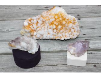 Treasure these items from Michael's Jewelry! One large amethyst crystal from Union County, SC, one smoky quartz amethyst crystal cluster from Anderson, SC, and one milk quartz with iron staining from Anderson, SC are selections you won't want to miss!