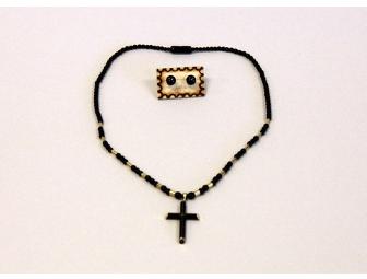 Handcrafted in Cuba, this stunning necklace and earring set will compliment an array of outfits. A 16-inch strand of black beads, accented by a cross and gold details, pair perfectly with black bead stud earrings. The set was hand-selected by your personal shoppers, Judith Kerch and Vicky Curtiss, on the 2010 Fourth Church Cuba Mission Trip.