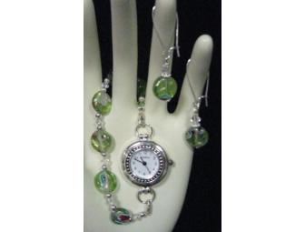 Lovely green beaded bracelet with silver watchface and matching green beaded pierced earrings.