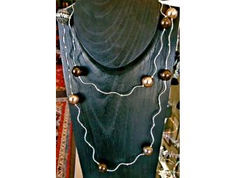 It is made of sterling silver tube beads, with tiny wooly mammoth ivory beads between each tube, and then further decorated with very dark brown and pearly-beige Swarovski pearls, plus one larger, elegantly carved Bali silver feature bead.